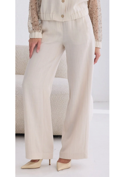 Wiskozowe spodnie w jasnym kolorze polskiej marki SALKO. Model swobodny z prostą, szerszą nogawką. W talii pasek z częściowo wszytą gumą z tyłu. Ukryte kieszenie w szwie bocznym. Delikatnie strukturalna tkanina.